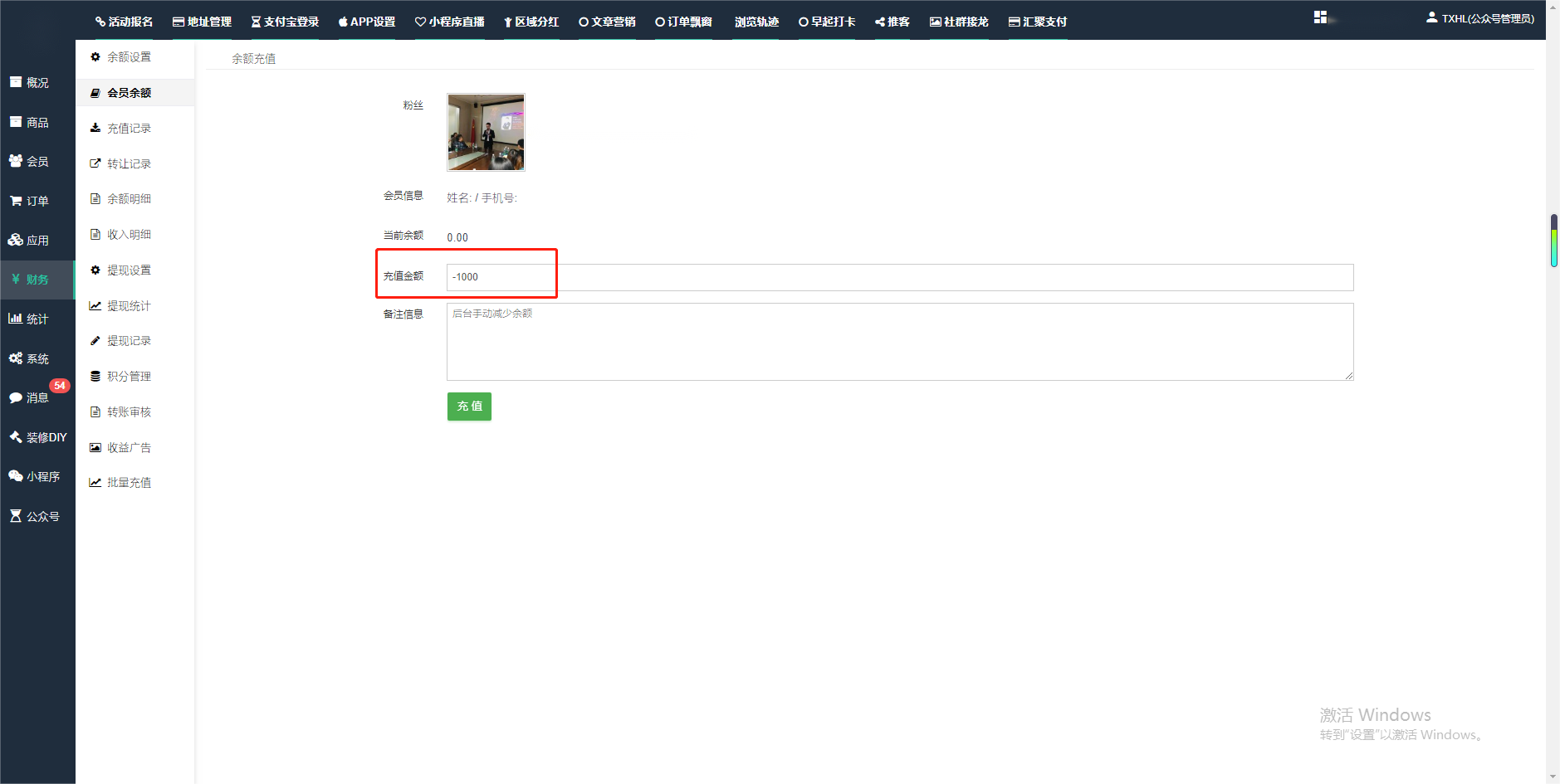 目录 搜索 展开 一、前期准备资料二、数字乡村码-上线操作指南1、服务号的申请流程及认证2、申请小程序流程3、开放平台绑定小程序和公众号三、数字乡村码-系统操作数字乡村码系统管理-概况数字乡村码-商品管理1、发布商品2、商品列表3、商品表单4、商品分类5、品牌管理6、配送模板7、评论管理8、优惠券管理9、商品标签10、退货地址设置11、满额优惠12、批量操作13、配送方式14、基础设置15、商品隐藏四、数字乡村码-会员管理1、全部会员2、会员等级3、会员分组4、资格申请5、会员设置6、推广中心设置7、会员邀请码8、会员关系链修改关系链修改记录9、会员合并记录10、账号注销管理11、会员设置中心五、数字乡村码-订单管理1、订单管理列表2、订单处理流程3、订单状态4、订单修改价格5、订单退款退货6、多包裹发货7、批量发货订单操作步骤8、催发货订单9、物流查询六、数字乡村码-财务管理1、余额设置2、会员余额3、充值记录4、转让记录5、余额明细6、收入明细7、提现设置8、提现统计9、积分管理10、转账审核11、收益广告12、批量充值七、数字乡村码-系统管理1、商城入口2、商城设置①、商城设置②、订单设置③、物流查询④、短信⑤、联系方式⑥、分类⑦、优惠券⑧、分享⑨、幻灯片⑩、广告位⑫、地图设置3、交易设置4、微信模板消息自定义消息模板(新版)自定义消息模板(旧版)小程序消息模板公众号模板消息变更公告5、语言设置6、权限管理7、多媒体管理八、数字乡村码-消息管理九、数字乡村码-应用管理十、数字乡村码系统-数据统计十一、数字乡村码-页面装修DIY1、模板管理2、店铺页面3、顶部导航4、底部导航5、DIY模板市场6、首屏广告7、基础设置8、装修DIY尺寸建议十二、供应商功能插件操作指南1、供应商2、门店-收银台门店申请和使用步骤门店管理①、门店-收银台 营销设置②、门店-收银台 分润设置门店分类门店申请门店审核门店商品门店商品订单收银台订单数据统计核销员基础设置默认设置门店装修3、微社区4、会务活动十三、营销插件操作指南活动报名提货卡新人奖微店问卷调查积分视频分享1、视频分享基础设置2、视频分享发现管理3、视频分享分类管理4、视频分享评论管理5、视频分享分红记录6、视频分享短视频中心每日红包幸运大抽奖签到优惠券二维码任务奖励优惠劵文章音频文章付费文章限时购新海报拓客卡操作流程积分活动素材中心视频红包十四、入驻门店应用类1、门店预约2、附近商品3、门店定位设置4、门店控制5、门店满额包邮6、门店满额减7、导入商品8、门店搜索9、门店股东10、核销券11、多门店核销1、商城后台设置2、前端功能演示十五、常见问题1、后台登录密码修改流程2、会员-余额,积分,后台如何进行充值与扣除3、如何修改上下级关系4、一种万能的获取商城小程序路径的方法 暂无相关搜索结果! 阅读次数:1673 本文档使用 模王系统 发布 2、会员-余额,积分,后台如何进行充值与扣除 会员-余额,积分,后台如何进行充值与扣除一.如何进行余额充值-扣除1.财务-会员余额-搜索会员昵称-右边点击充值余额2.扣除余额,只需要在充值金额前加上 - 号;比如充值-100,等于扣除100余额二,如何手动充值积分-扣除积分(充值与扣除逻辑跟余额是一样的)文档更新时间: 2024-01-05 14:28 作者:链上旅行