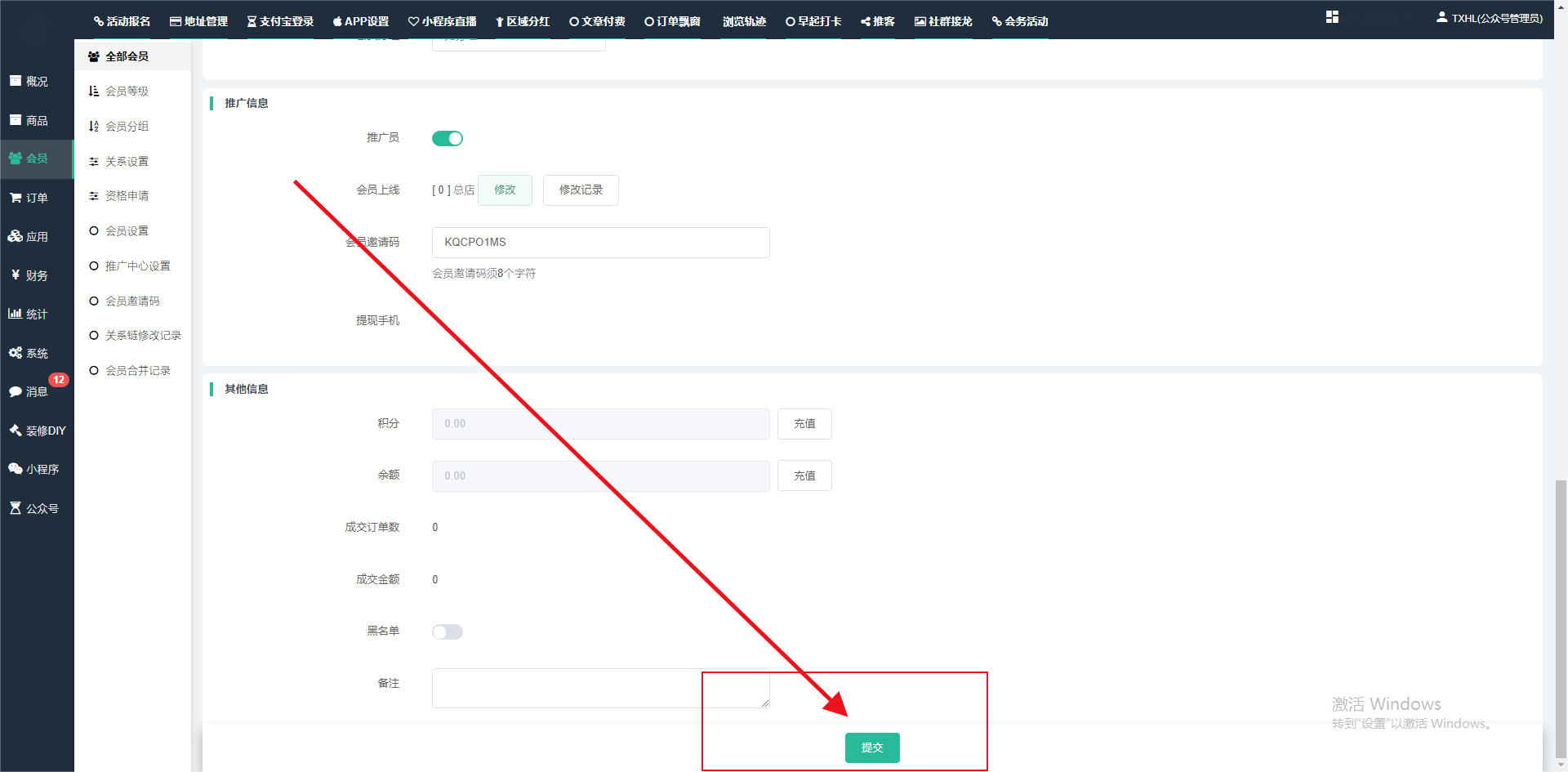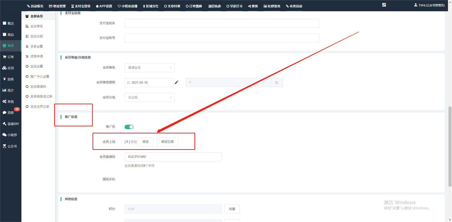 目录 搜索 展开 一、前期准备资料二、数字乡村码-上线操作指南1、服务号的申请流程及认证2、申请小程序流程3、开放平台绑定小程序和公众号三、数字乡村码-系统操作数字乡村码系统管理-概况数字乡村码-商品管理1、发布商品2、商品列表3、商品表单4、商品分类5、品牌管理6、配送模板7、评论管理8、优惠券管理9、商品标签10、退货地址设置11、满额优惠12、批量操作13、配送方式14、基础设置15、商品隐藏四、数字乡村码-会员管理1、全部会员2、会员等级3、会员分组4、资格申请5、会员设置6、推广中心设置7、会员邀请码8、会员关系链修改关系链修改记录9、会员合并记录10、账号注销管理11、会员设置中心五、数字乡村码-订单管理1、订单管理列表2、订单处理流程3、订单状态4、订单修改价格5、订单退款退货6、多包裹发货7、批量发货订单操作步骤8、催发货订单9、物流查询六、数字乡村码-财务管理1、余额设置2、会员余额3、充值记录4、转让记录5、余额明细6、收入明细7、提现设置8、提现统计9、积分管理10、转账审核11、收益广告12、批量充值七、数字乡村码-系统管理1、商城入口2、商城设置①、商城设置②、订单设置③、物流查询④、短信⑤、联系方式⑥、分类⑦、优惠券⑧、分享⑨、幻灯片⑩、广告位⑫、地图设置3、交易设置4、微信模板消息自定义消息模板(新版)自定义消息模板(旧版)小程序消息模板公众号模板消息变更公告5、语言设置6、权限管理7、多媒体管理八、数字乡村码-消息管理九、数字乡村码-应用管理十、数字乡村码系统-数据统计十一、数字乡村码-页面装修DIY1、模板管理2、店铺页面3、顶部导航4、底部导航5、DIY模板市场6、首屏广告7、基础设置8、装修DIY尺寸建议十二、供应商功能插件操作指南1、供应商2、门店-收银台门店申请和使用步骤门店管理①、门店-收银台 营销设置②、门店-收银台 分润设置门店分类门店申请门店审核门店商品门店商品订单收银台订单数据统计核销员基础设置默认设置门店装修3、微社区4、会务活动十三、营销插件操作指南活动报名提货卡新人奖微店问卷调查积分视频分享1、视频分享基础设置2、视频分享发现管理3、视频分享分类管理4、视频分享评论管理5、视频分享分红记录6、视频分享短视频中心每日红包幸运大抽奖签到优惠券二维码任务奖励优惠劵文章音频文章付费文章限时购新海报拓客卡操作流程积分活动素材中心视频红包十四、入驻门店应用类1、门店预约2、附近商品3、门店定位设置4、门店控制5、门店满额包邮6、门店满额减7、导入商品8、门店搜索9、门店股东10、核销券11、多门店核销1、商城后台设置2、前端功能演示十五、常见问题1、后台登录密码修改流程2、会员-余额,积分,后台如何进行充值与扣除3、如何修改上下级关系4、一种万能的获取商城小程序路径的方法 暂无相关搜索结果! 阅读次数:1504 本文档使用 模王系统 发布 3、如何修改上下级关系 如何修改上下级关系一.如何修改上下级关系?1.会员-全部会员-可以通过搜索用户的独立ID,或者用户微信昵称,找到此会员,然后点击右边的(操作)2.再点击会员详情。3.滑到下面,有个推广信息-会员上线,点击修改4.输入上级的ID号,点击搜索,出来此上级会员后点击选择。5.滑到最下面,一定要点击提交按钮。文档更新时间: 2024-01-05 14:50 作者:链上旅行